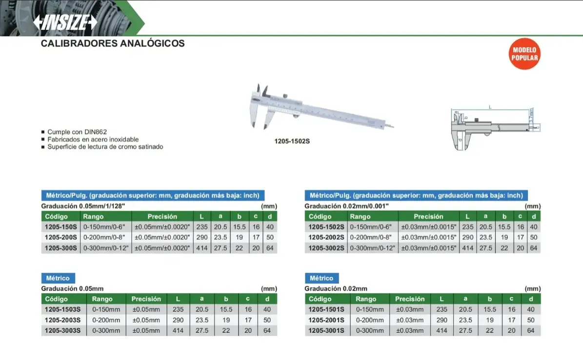| Resolución / Graduación | 0.02 mm / 0.001″ |